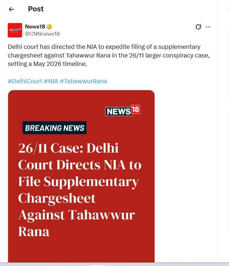 नई दिल्ली: पटियाला हाउस कोर्ट ने राष्ट्रीय जांच एजेंसी (NIA) को निर्देश दिया है कि वह 26/11 मुंबई आतंकी हमले से जुड़े बड़े षड्यंत्र मामले में आरोपी तहव्वुर राणा के खिलाफ सप्लीमेंट्री चार्जशीट दाखिल करने की प्रक्रिया में तेजी लाए। अदालत ने एजेंसी से कहा है कि वह मई 2026 तक यह कार्य पूरा करने का प्रयास करे। इस मामले की अगली सुनवाई 24 अप्रैल को निर्धारित की गई है।