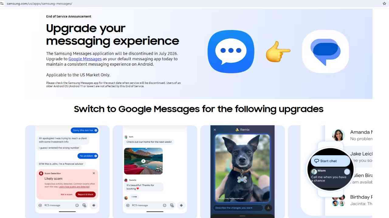 यूज़र्स को सलाह दी गई है कि वे अपने Samsung Messages ऐप में जाकर अपने डिवाइस के अनुसार सटीक बंद होने की तारीख की जांच कर लें। रिपोर्ट के मुताबिक, नए सैमसंग डिवाइस पहले से ही Google Messages के साथ प्री-इंस्टॉल्ड आ रहे हैं। Samsung Galaxy S25 सीरीज और फोल्डेबल मॉडल जैसे Samsung Galaxy Z Fold6 और Samsung Galaxy Z Flip6 में Google Messages डिफॉल्ट मैसेजिंग ऐप के रूप में मौजूद है।