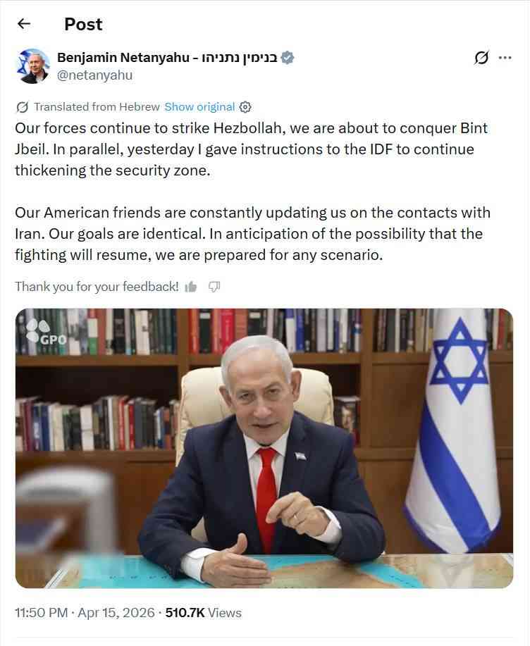 — Benjamin Netanyahu - בנימין נתניהו (@netanyahu) April 15, 2026