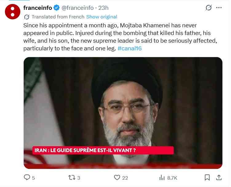 Depuis sa nomination il y a un mois, Mojtaba Khamenei n’est jamais apparu publiquement. Blessé lors du bombardement qui a tué son père, sa femme et son fils, le nouveau guide suprême serait gravement atteint, notamment au visage et à une jambe. #canal16 pic.twitter.com/xgyEurJV8E